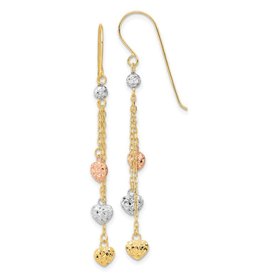14k Tri-color D/C Triple Heart Dangle Shepherd Hook Earrings