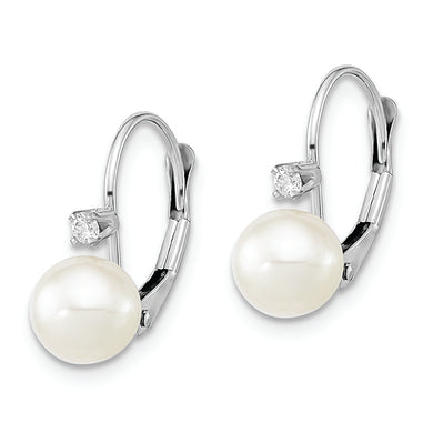 14K White Gold 6-7mm Round White FWC Pearl .06ct. Dia. Leverback Earrings