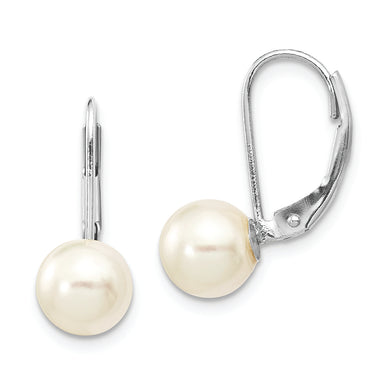 14K White Gold 7-8mm Round White Saltwater Akoya Pearl Leverback Earrings